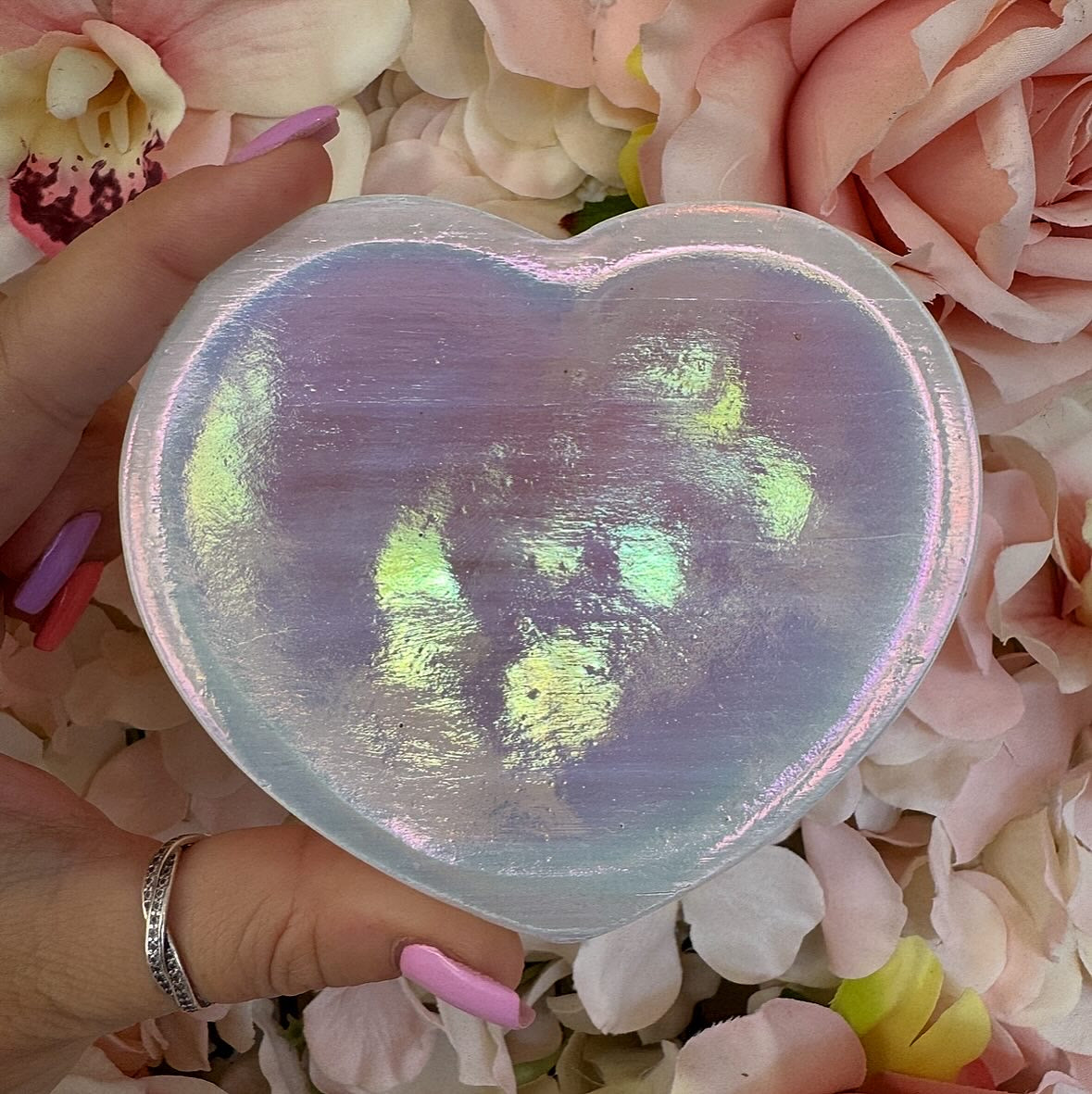 Cleanse and charge your crystals, uplift your space and embrace iridescent beauty with this Aura Selenite Shallow Dish Carving — the perfect fusion of function and magical décor.